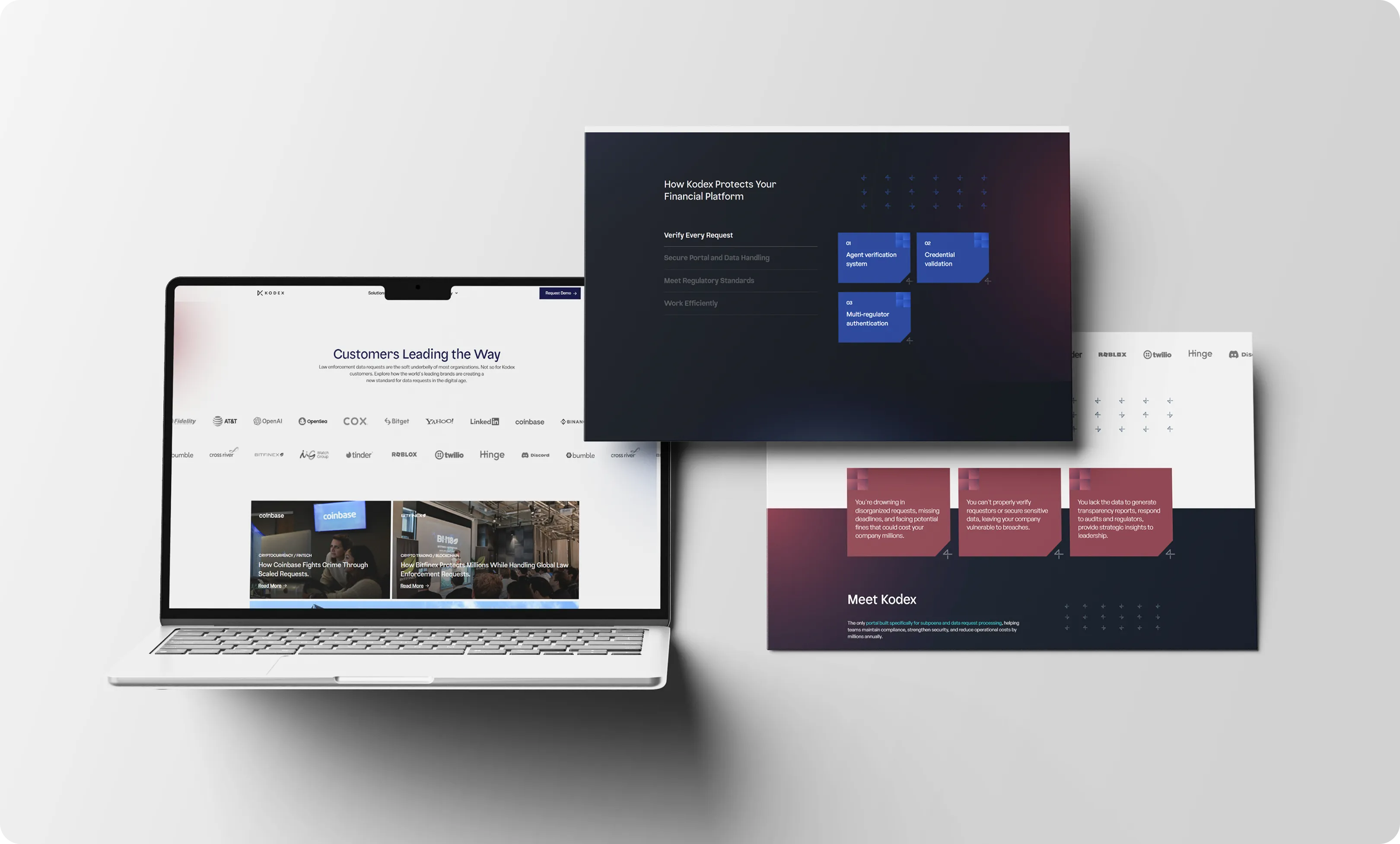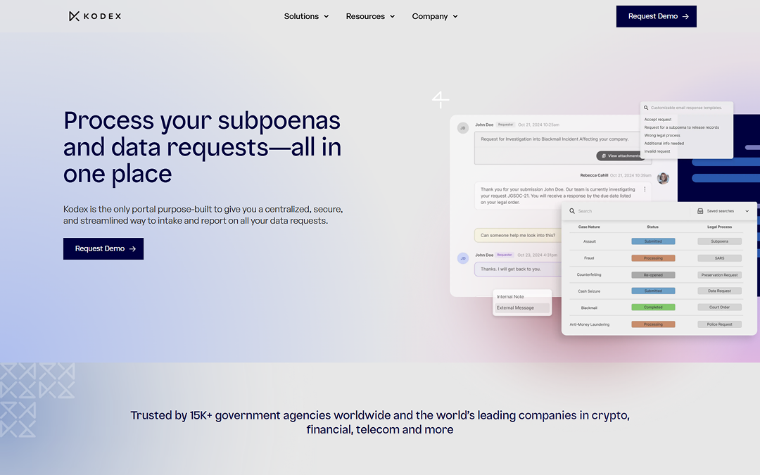 Kodex powers subpoenas and data-request workflows for 15,000+ government agencies. Binance uses them to prevent data breaches. Coinbase hits a button and generates transparency reports. None of this was obvious on the old site.